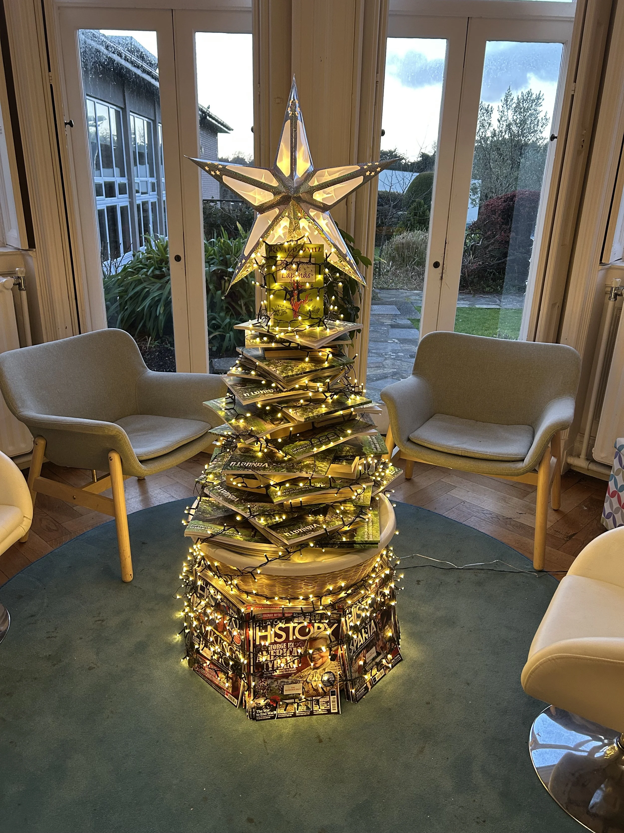 Our book-themed Christmas tree is up in the library and spreading lots of festive cheer! Made with books and magazines, it’s a cute and creative celebration of reading and the heart of our library. A special thank you to Penelope Smith-Tennyson and Laura Finucane for helping pile up the books and bring this special Christmas tree to us.